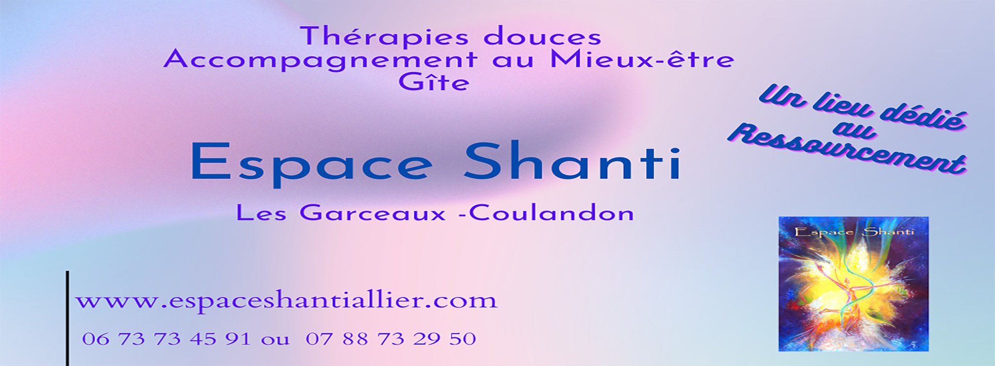 L’Espace Shanti, situé à Coulandon, lieu-dit Les Garceaux, vous propose des soins dédiés à la thérapie alternative, des stages d’accompagnement au mieux-être et à l’Eveil de Conscience ainsi qu’un hébergement indépendant pour des week-ends de ressourcement ou simplement vivre une parenthèse enchantée dans son gîte.